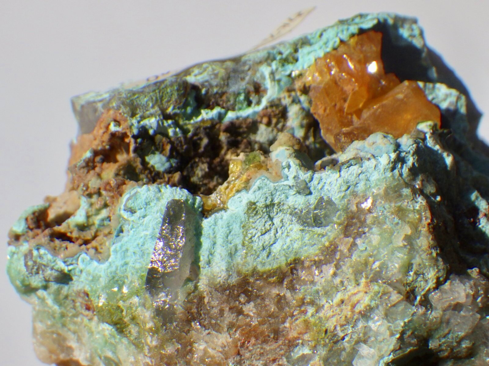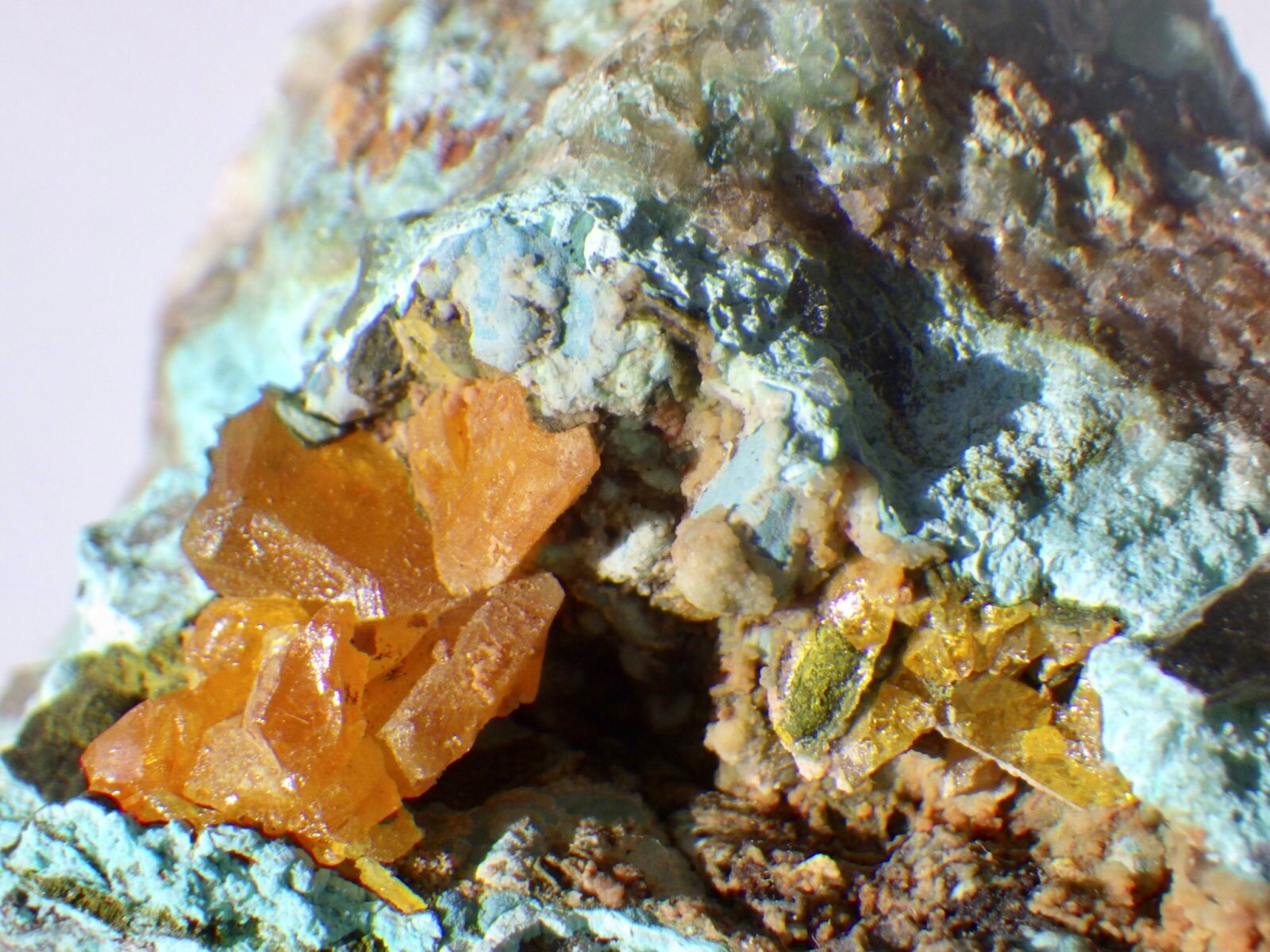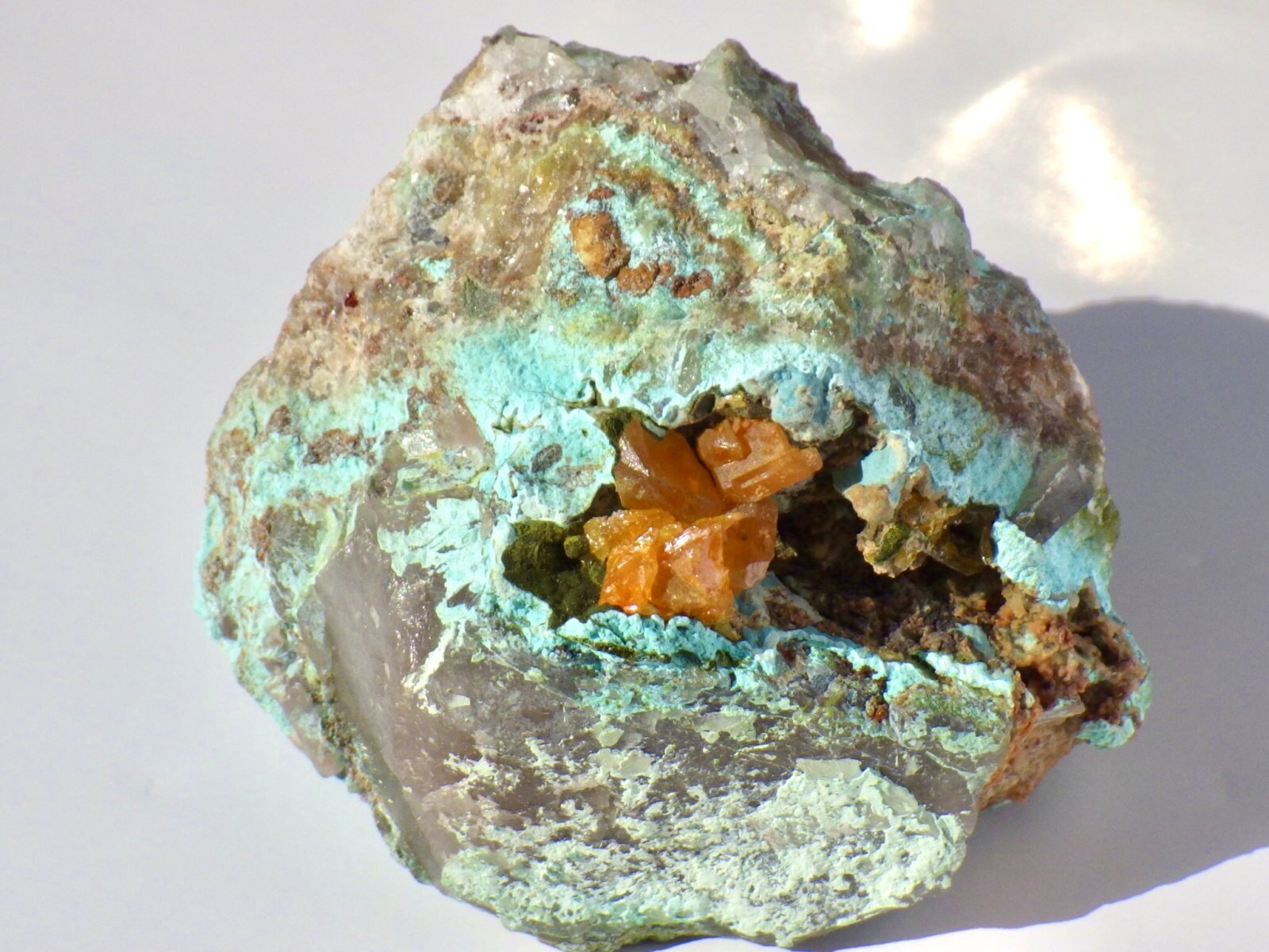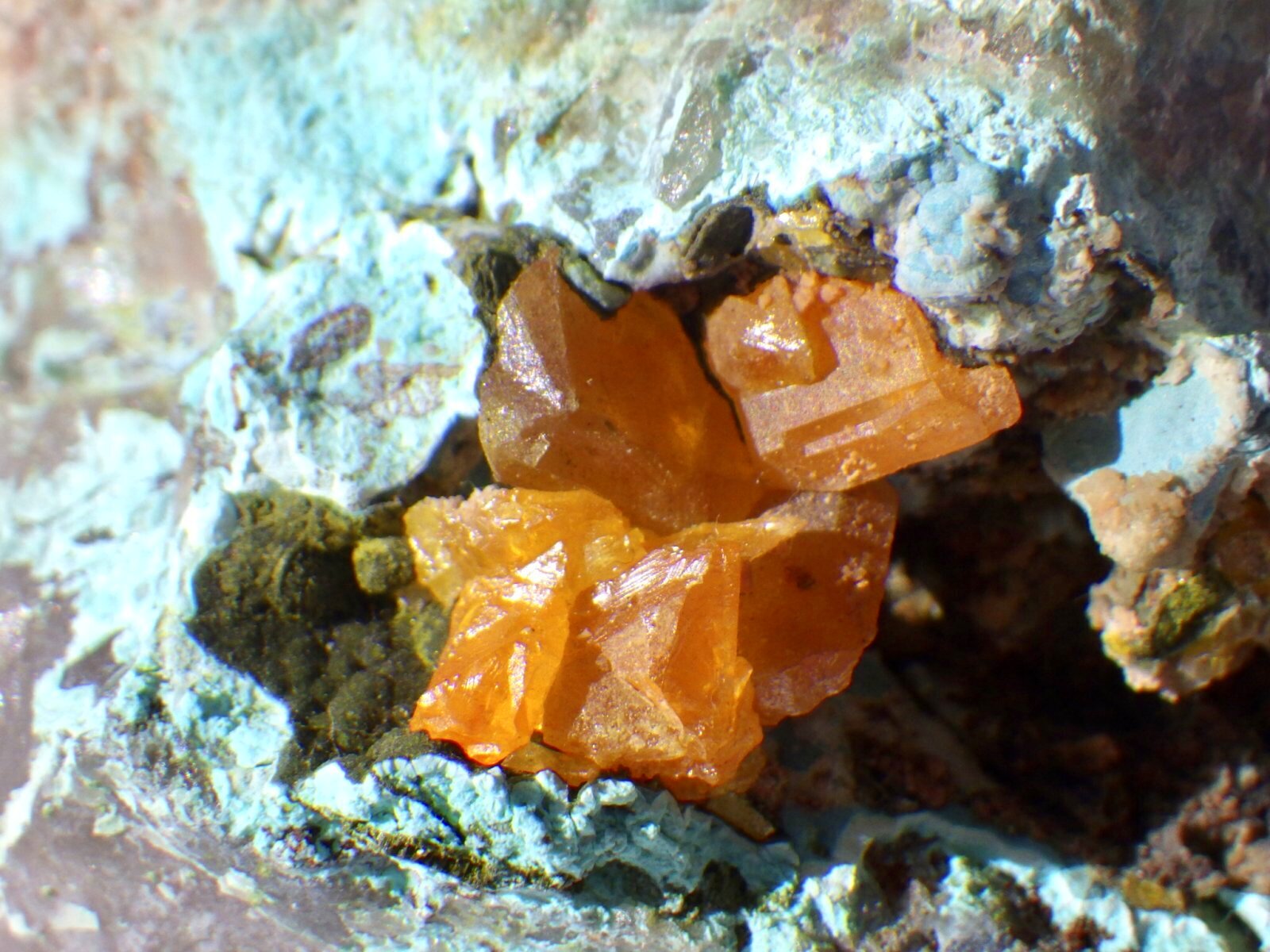 母岩は石英とクリソコラの混合体で、ウルフェナイトの色合いをより一層引き立てています。