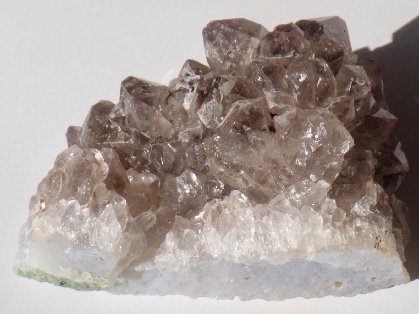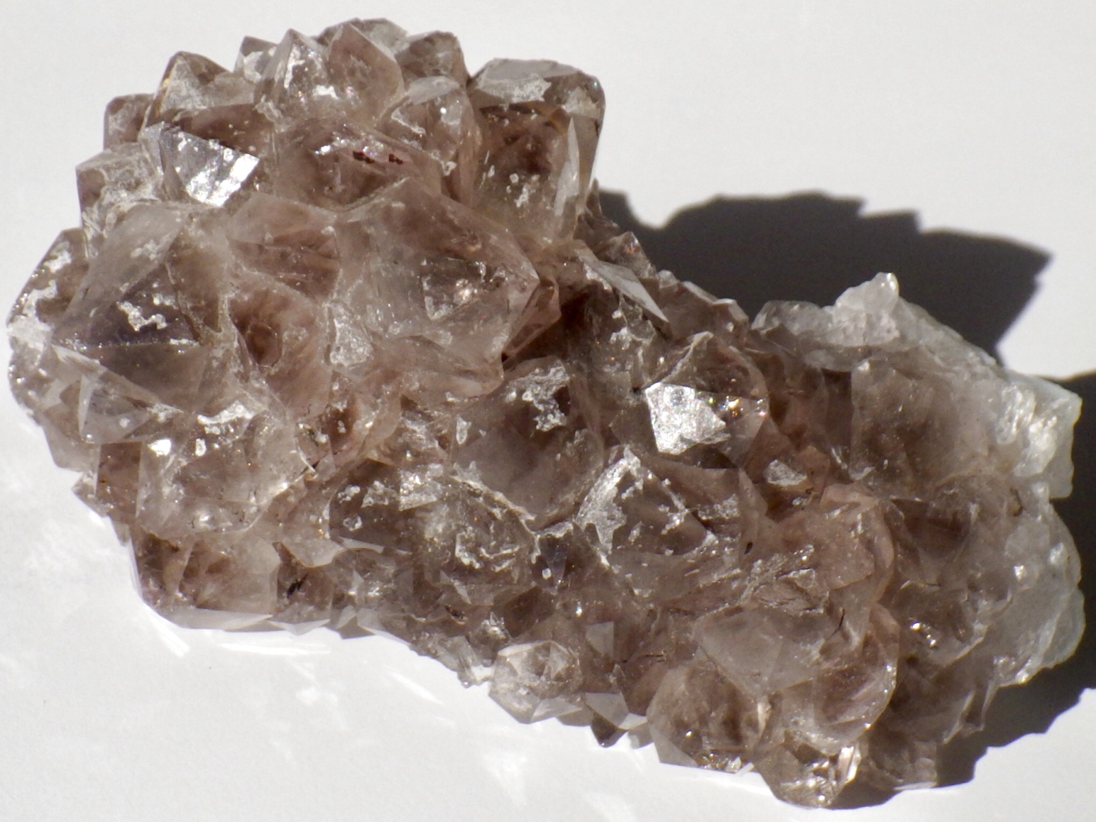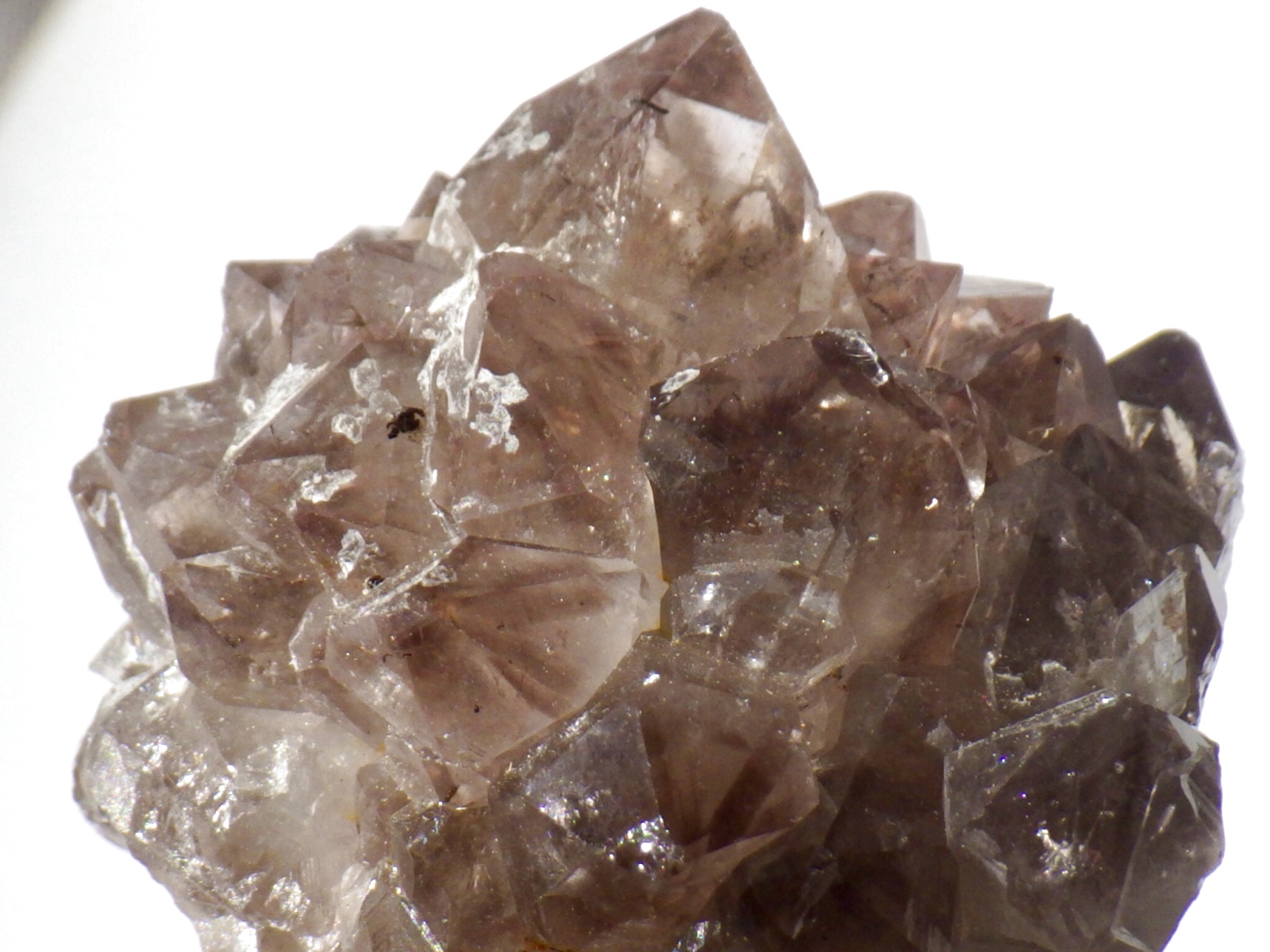 淡いスモーキークォーツで、パイナップルと呼ばれるタイプの放射状の結晶の集合体になっている様子が楽しめます。