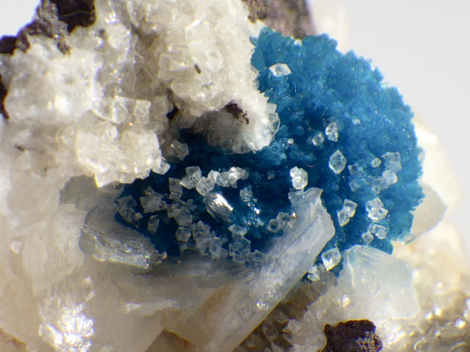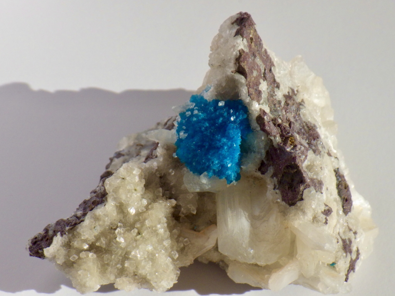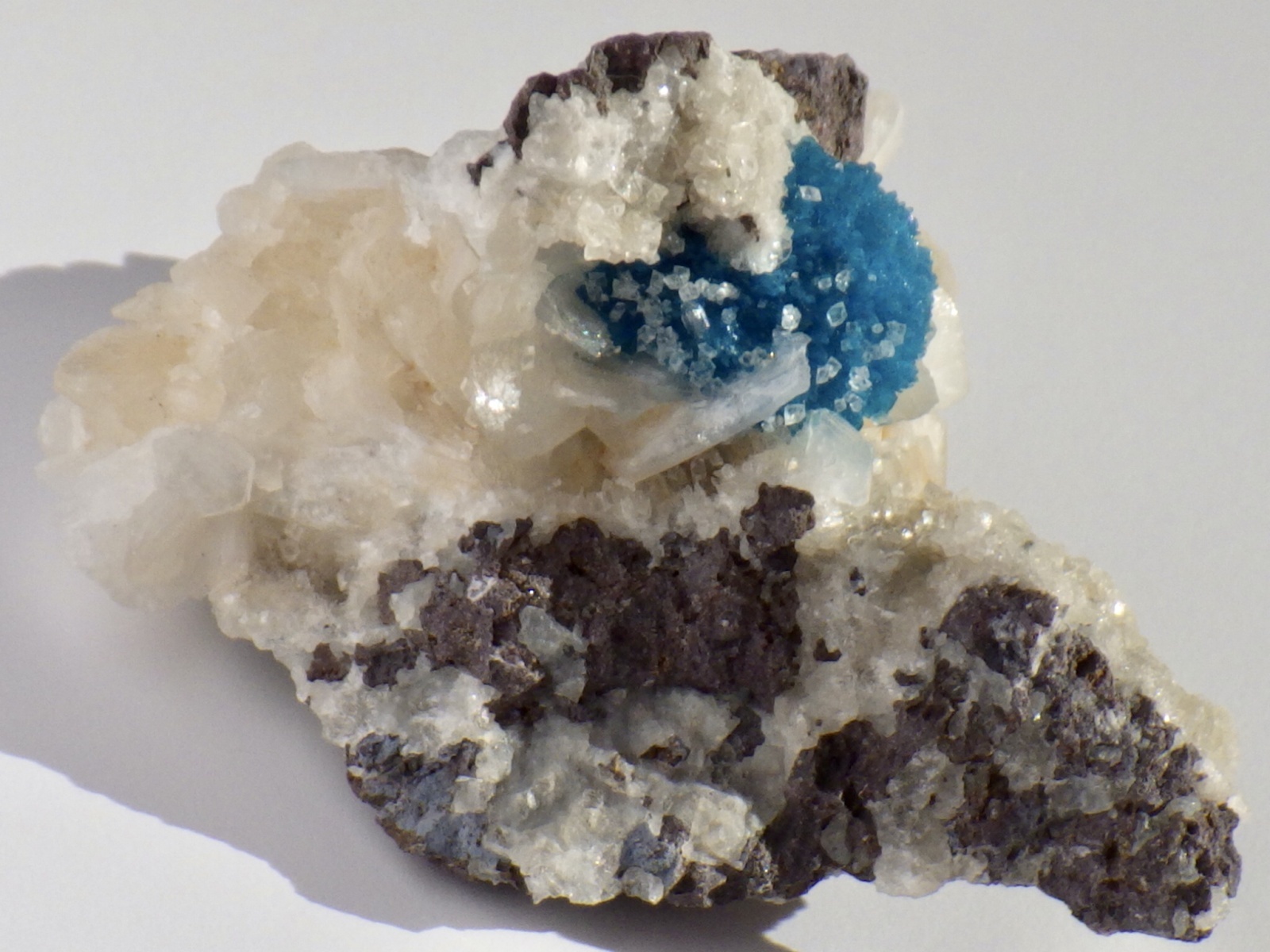 カバンサイトの表面の一部に細かいカルサイトや束沸石がキラキラ光ります。