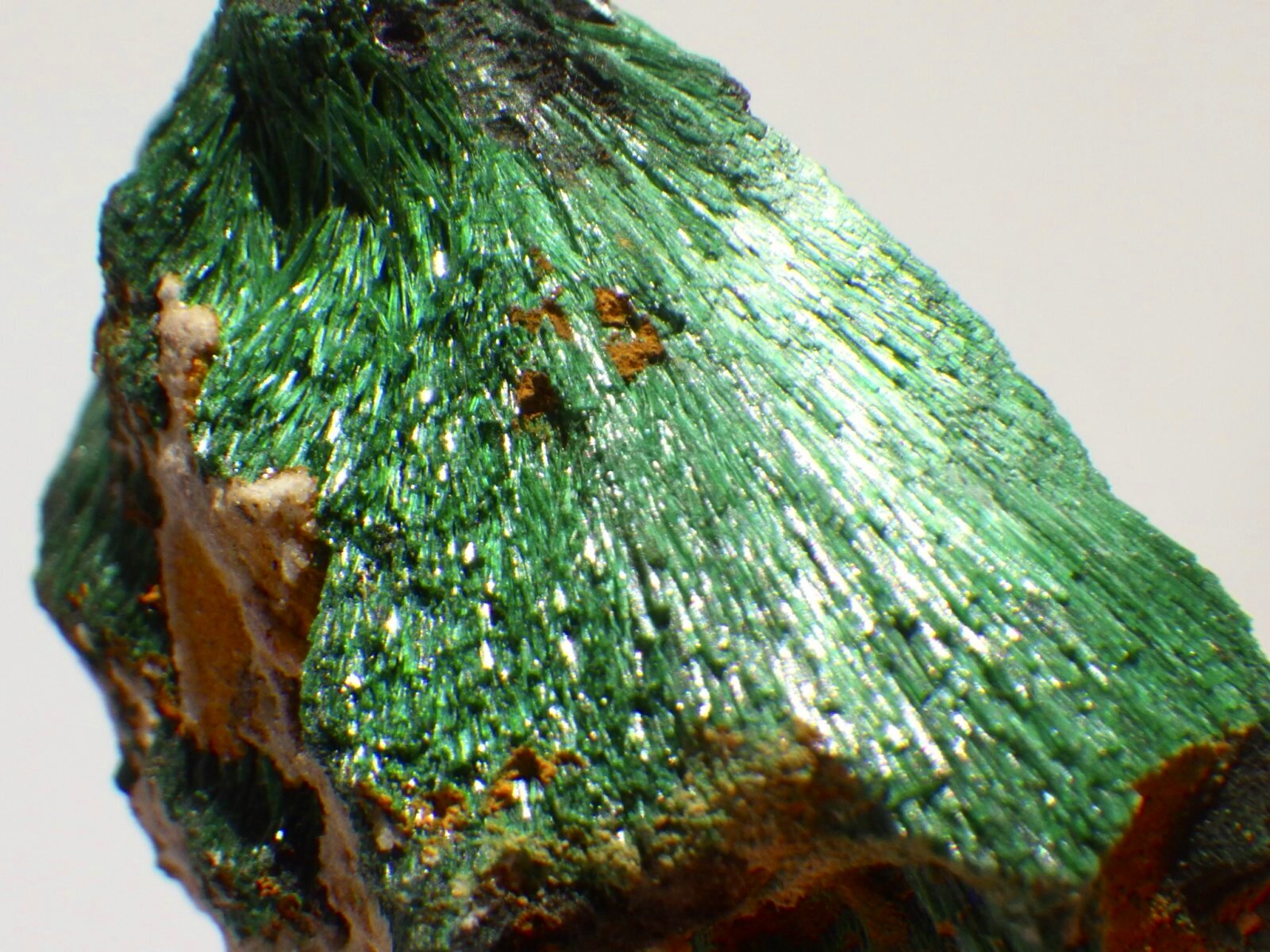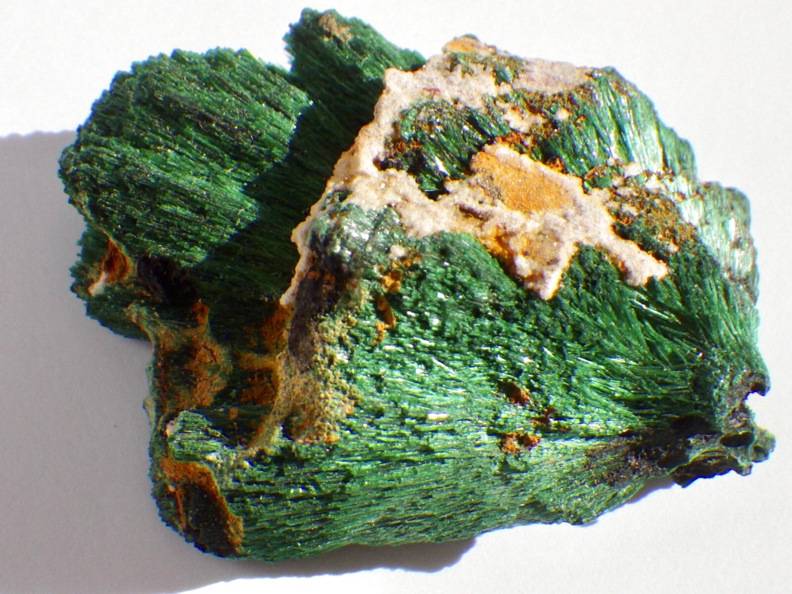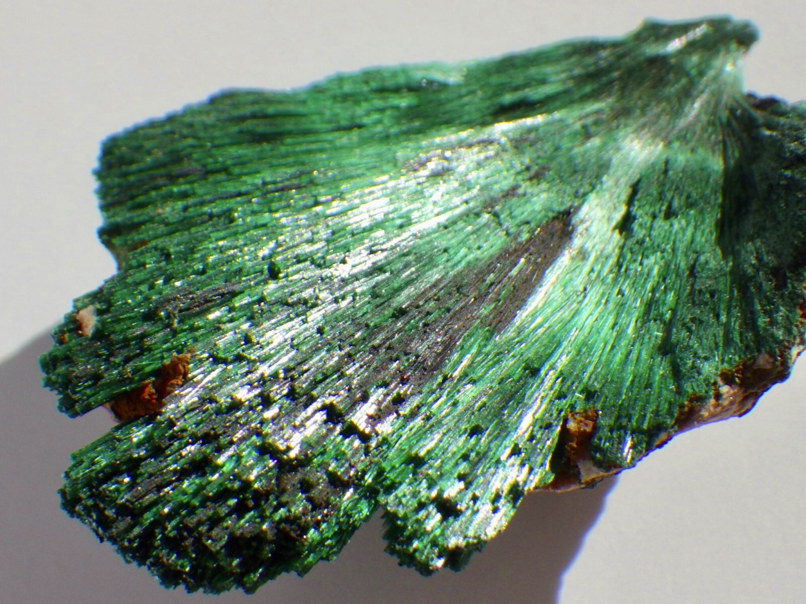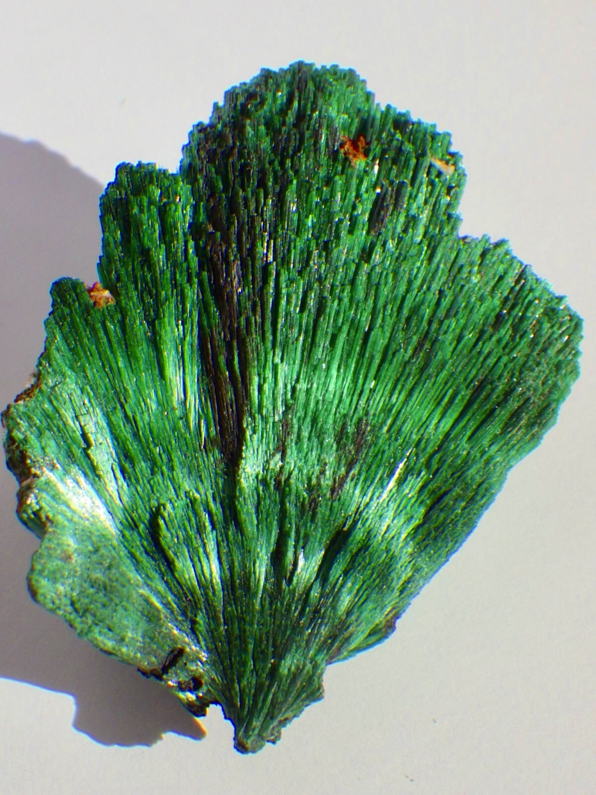 きめ細かい結晶が立体的に集合していて、ビロード状の光沢や鮮やかなグリーンがとても美しいです。扇型に広がっているのも特徴です。