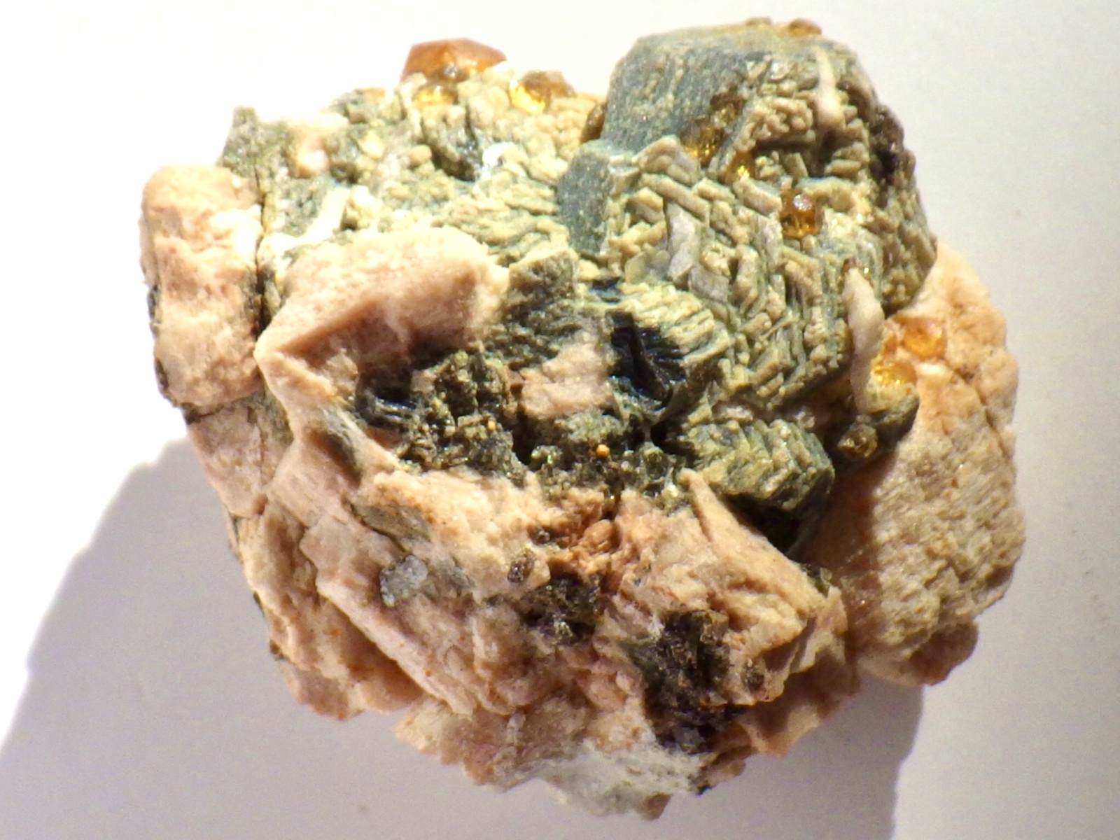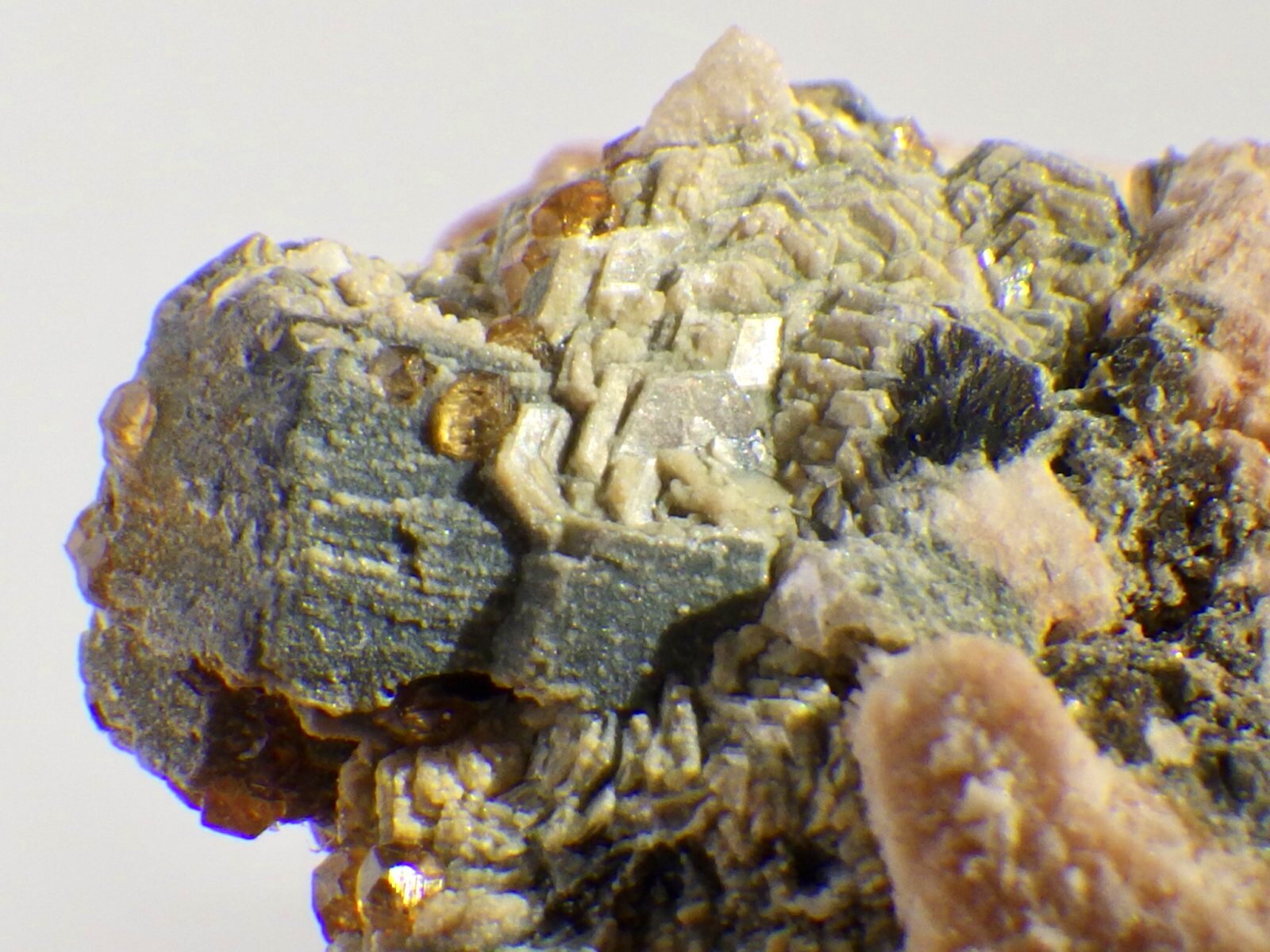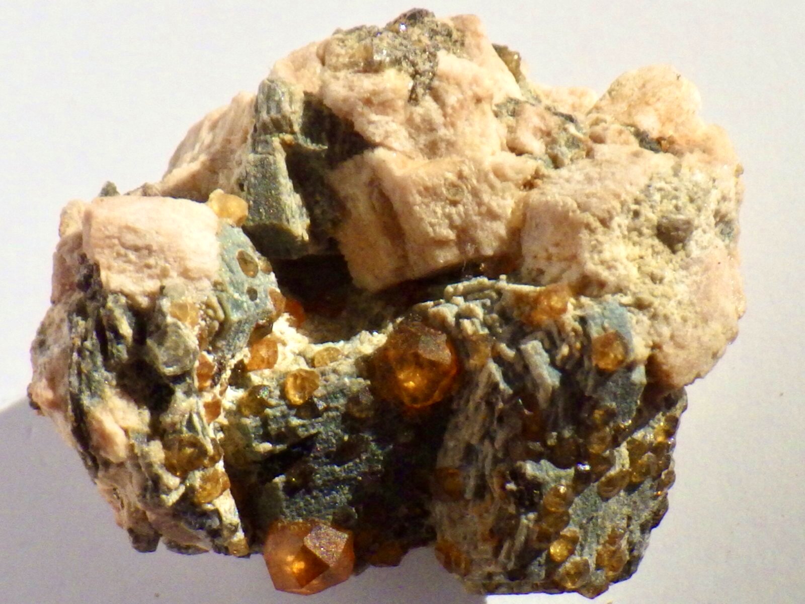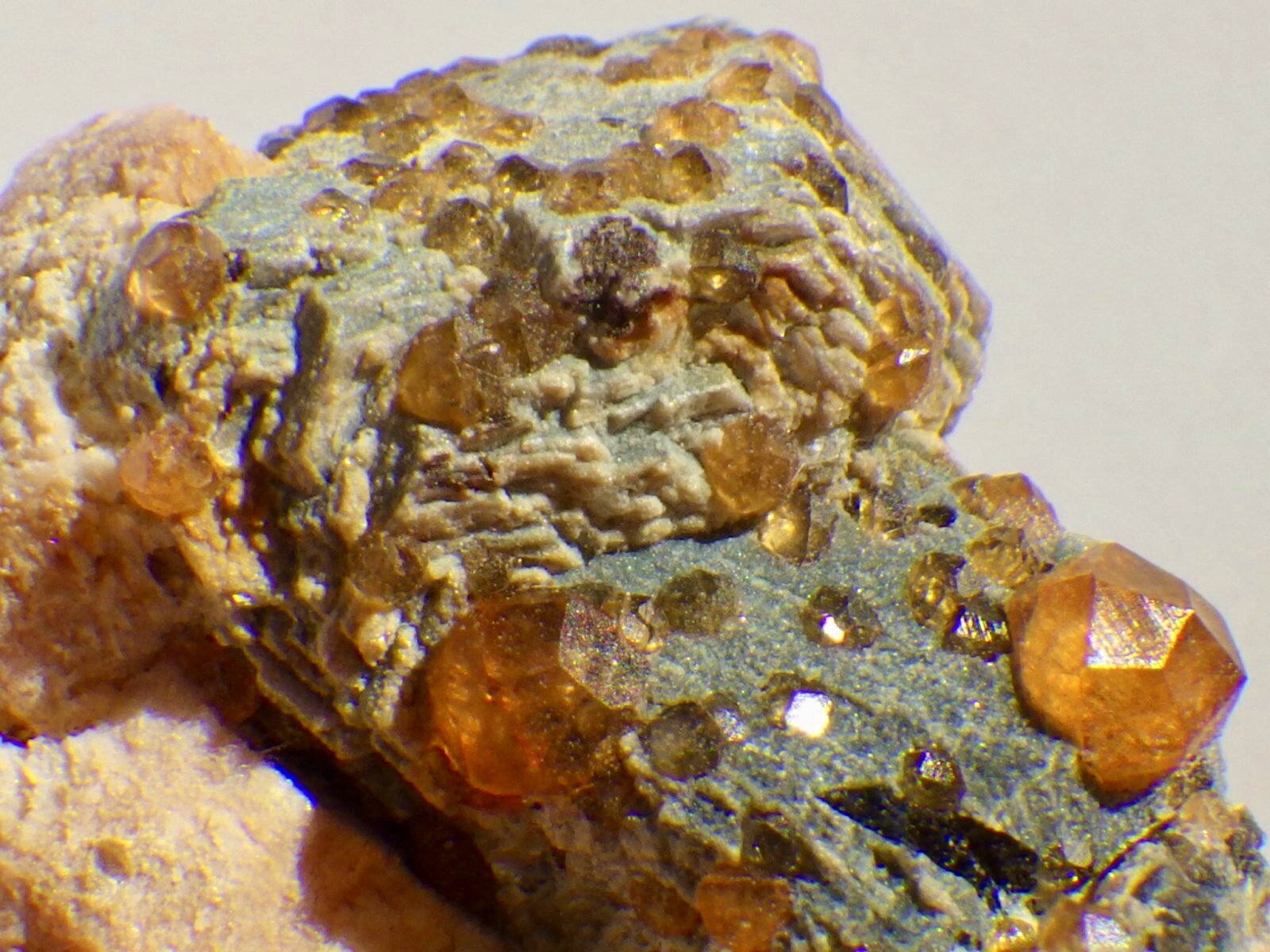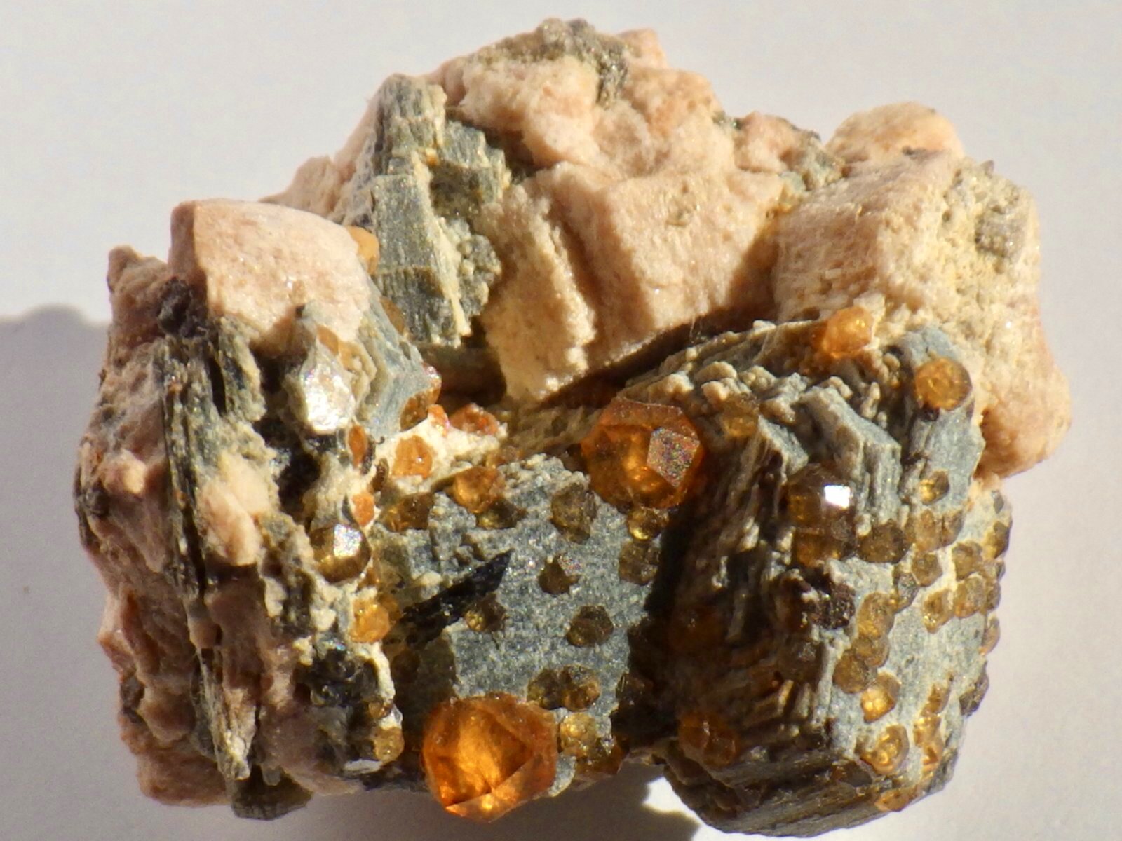 やや小粒のガーネットが雲母に沢山貫入している様子が見られます。